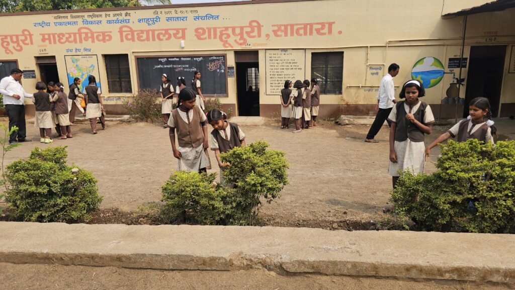 Each school day at Shahupuri Secondary School begins with the National Anthem, the National Pledge, a reading from the Constitution, the Maharashtra State Song, and the devotional hymn Pasaydan. At day’s end, students close with Vande Mataram.